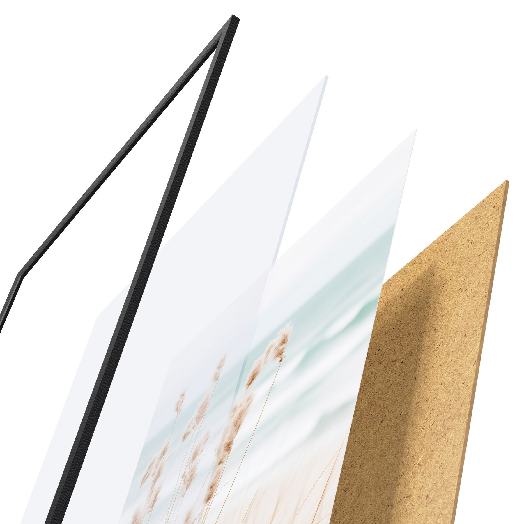 Plakat składa się z ramy, pleksi, wydrukowanego obrazu i podkładu z płyty wiórowej. Plakat można natychmiast zawiesić na ścianie dzięki uchwytom z tyłu.