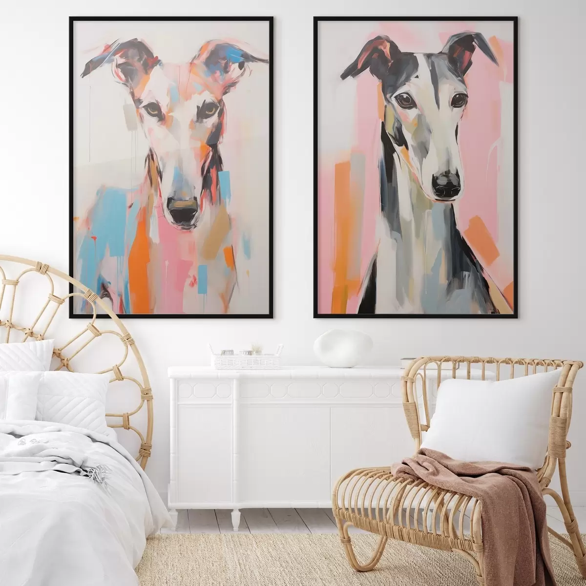 Plakat Pies rasy chart, pomalowany na żywe kolory, takie jak pomarańczowy, różowy i niebieski, na białym tle d00652