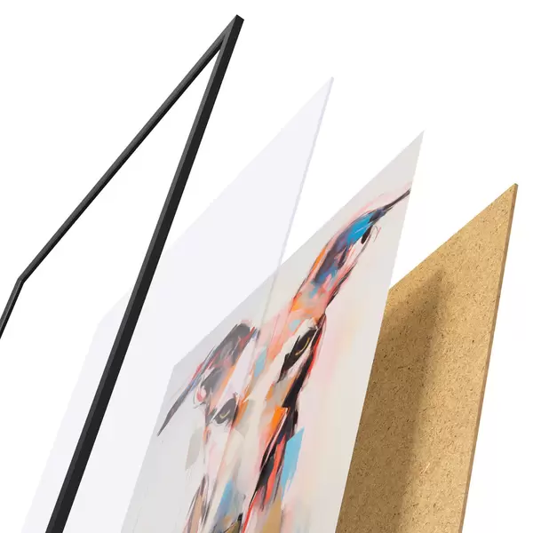 Plakat składa się z ramy, pleksi, wydrukowanego obrazu i podkładu z płyty wiórowej. Plakat można natychmiast zawiesić na ścianie dzięki uchwytom z tyłu.