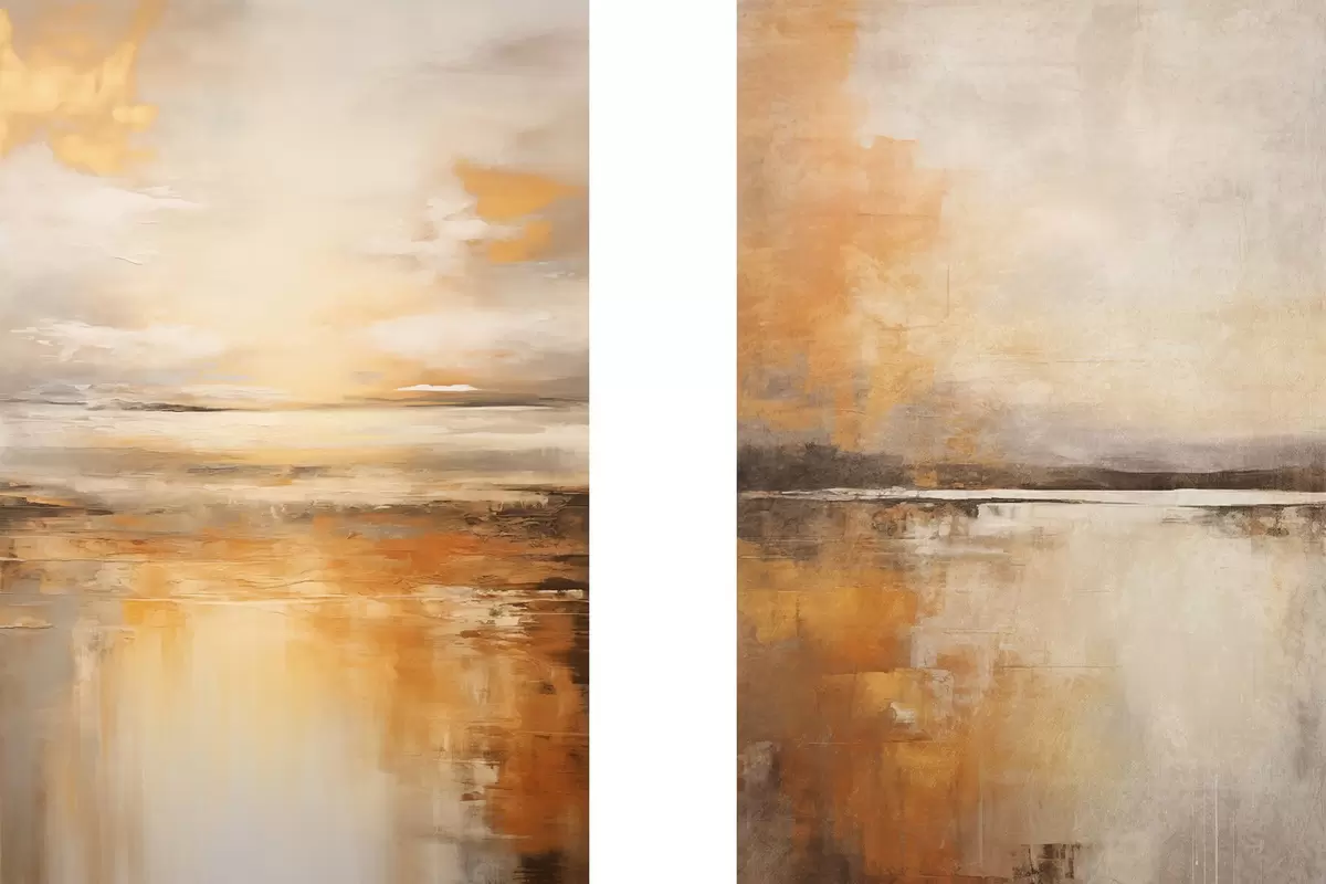 Plakat Abstrakcyjny obraz plażowego krajobrazu ze spokojnym oceanem, pomarańczowym piaskiem i zachmurzonym niebem ze słońcem d00653