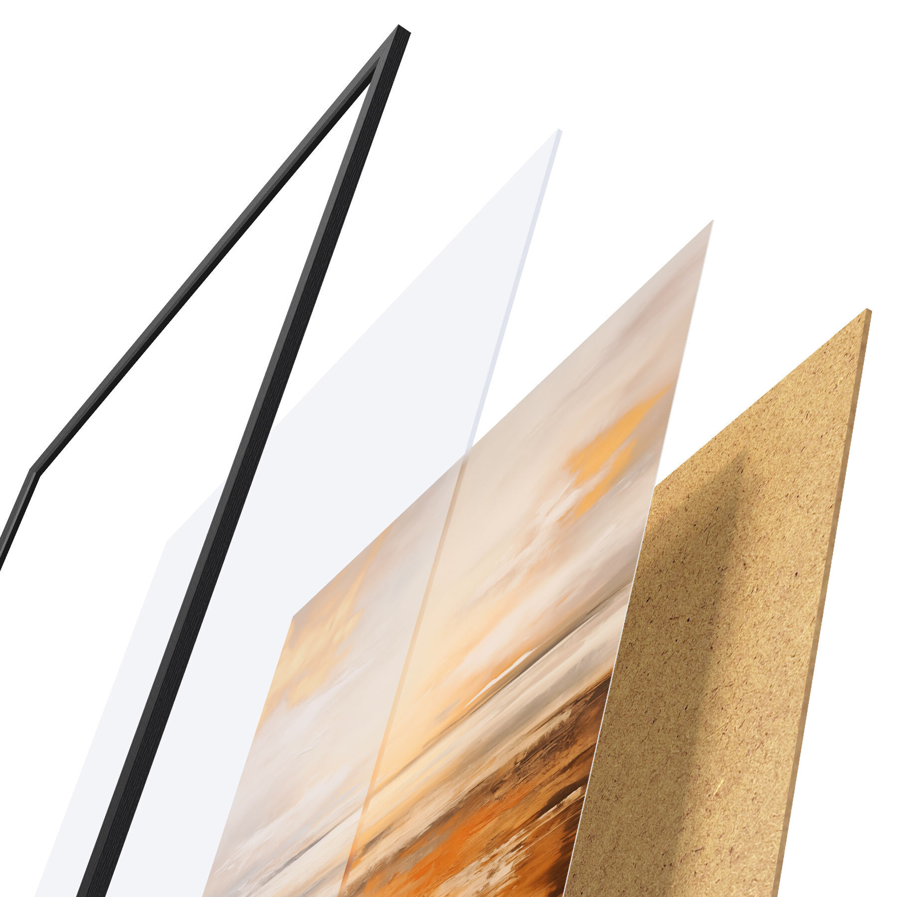 Plakat składa się z ramy, pleksi, wydrukowanego obrazu i podkładu z płyty wiórowej. Plakat można natychmiast zawiesić na ścianie dzięki uchwytom z tyłu.