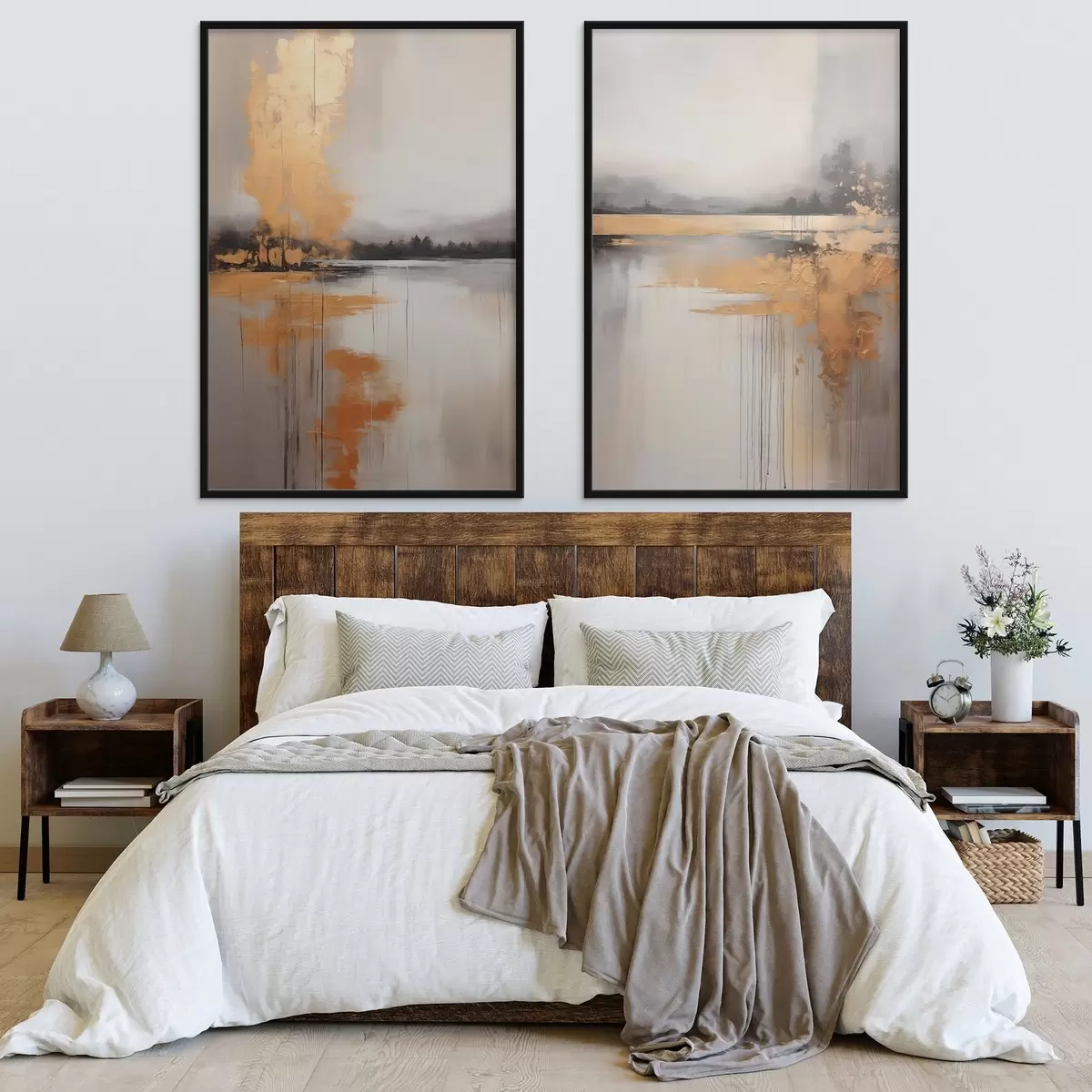Plakat Abstrakcyjny krajobraz z jeziorem, drzewem i żółtą mgłą, woda odbija się i zachmurzone niebo d00657