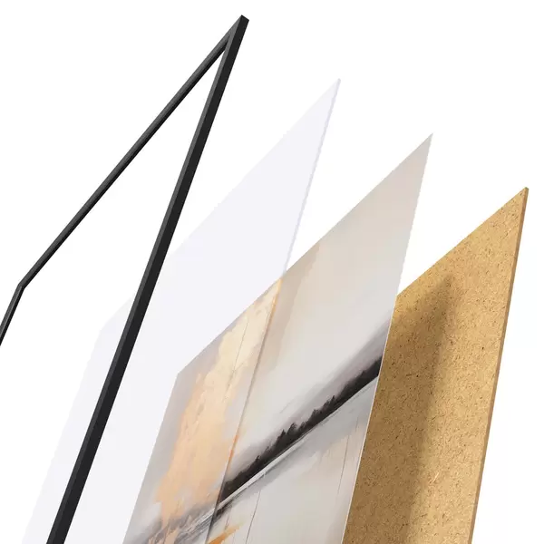 Plakat składa się z ramy, pleksi, wydrukowanego obrazu i podkładu z płyty wiórowej. Plakat można natychmiast zawiesić na ścianie dzięki uchwytom z tyłu.