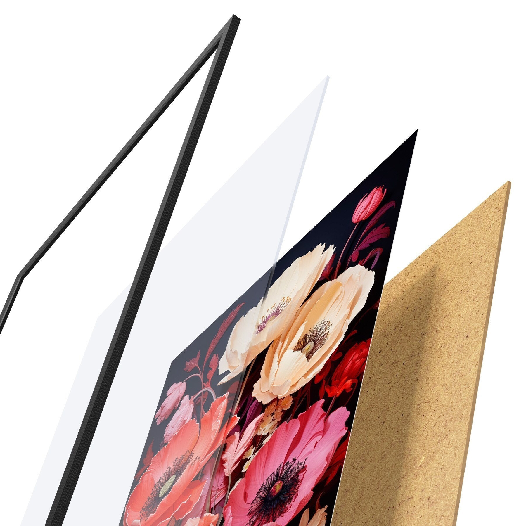 Plakat składa się z ramy, pleksi, wydrukowanego obrazu i podkładu z płyty wiórowej. Plakat można natychmiast zawiesić na ścianie dzięki uchwytom z tyłu.