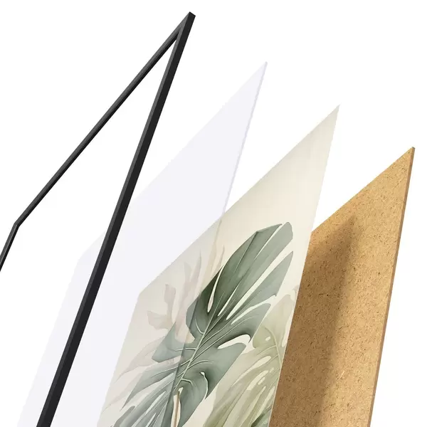 Plakat składa się z ramy, pleksi, wydrukowanego obrazu i podkładu z płyty wiórowej. Plakat można natychmiast zawiesić na ścianie dzięki uchwytom z tyłu.