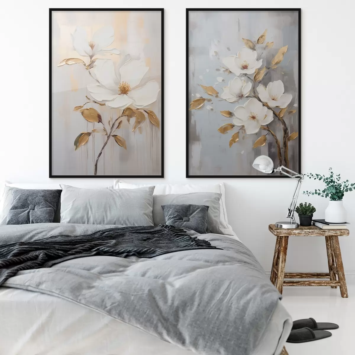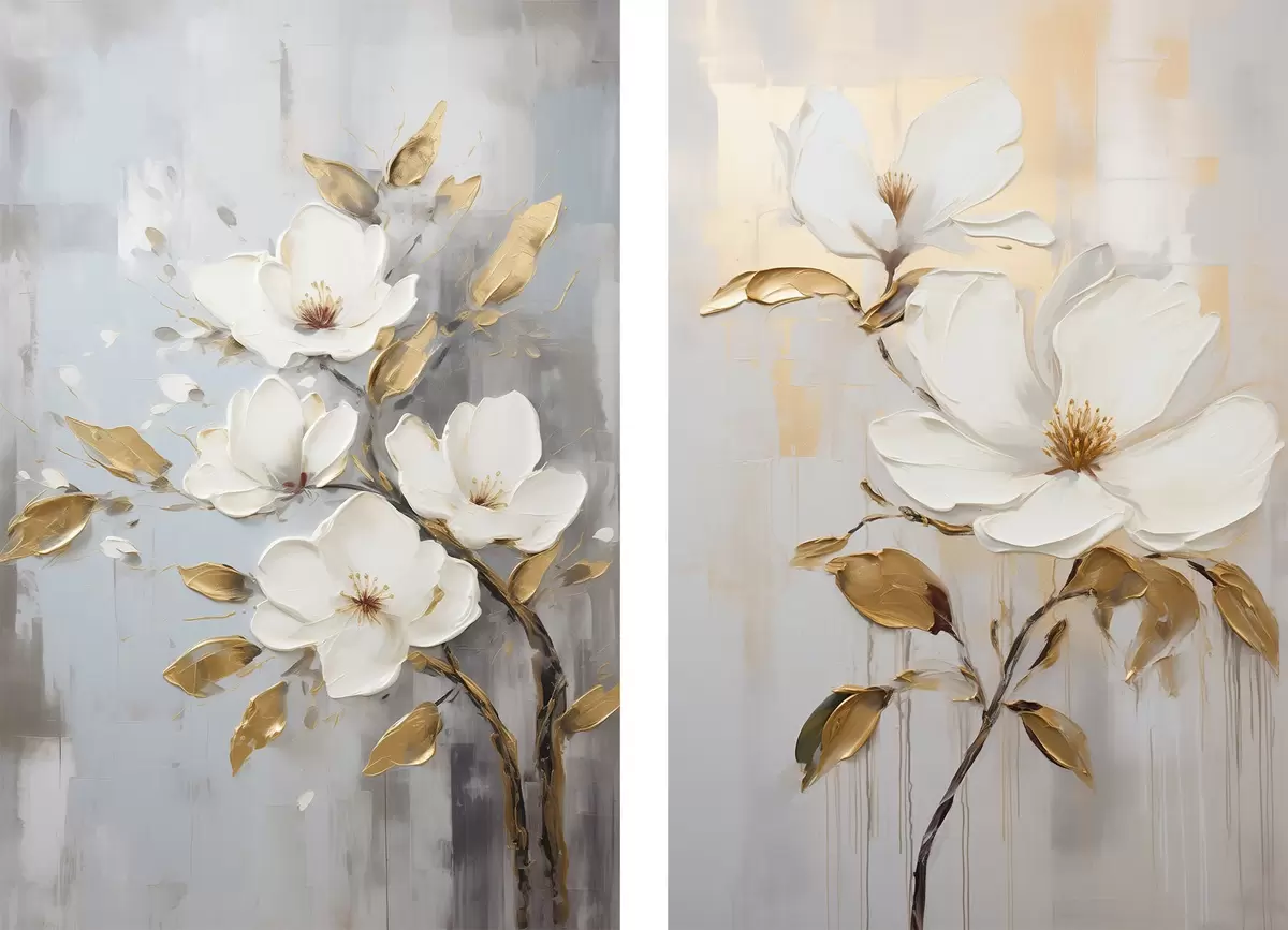 Plakat Dwa białe kwiaty z żółto-pomarańczowymi liśćmi na jasnym tle d00687