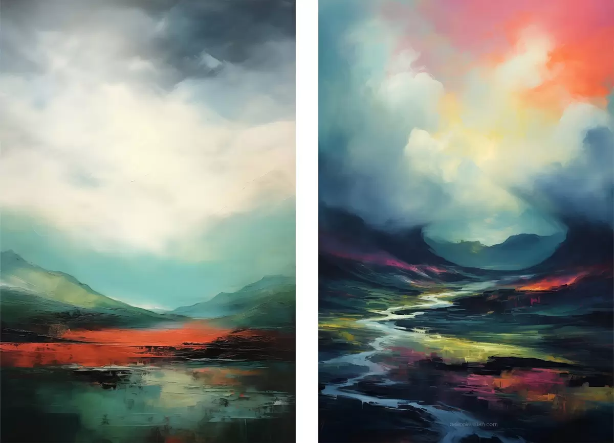Poster Abstrakcyjny krajobraz z chmurami w odcieniach turkusu i czerwieni Nr d00691