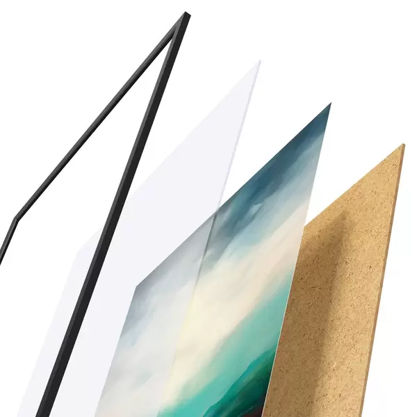 Plakat składa się z ramy, pleksi, wydrukowanego obrazu i podkładu z płyty wiórowej. Plakat można natychmiast zawiesić na ścianie dzięki uchwytom z tyłu.