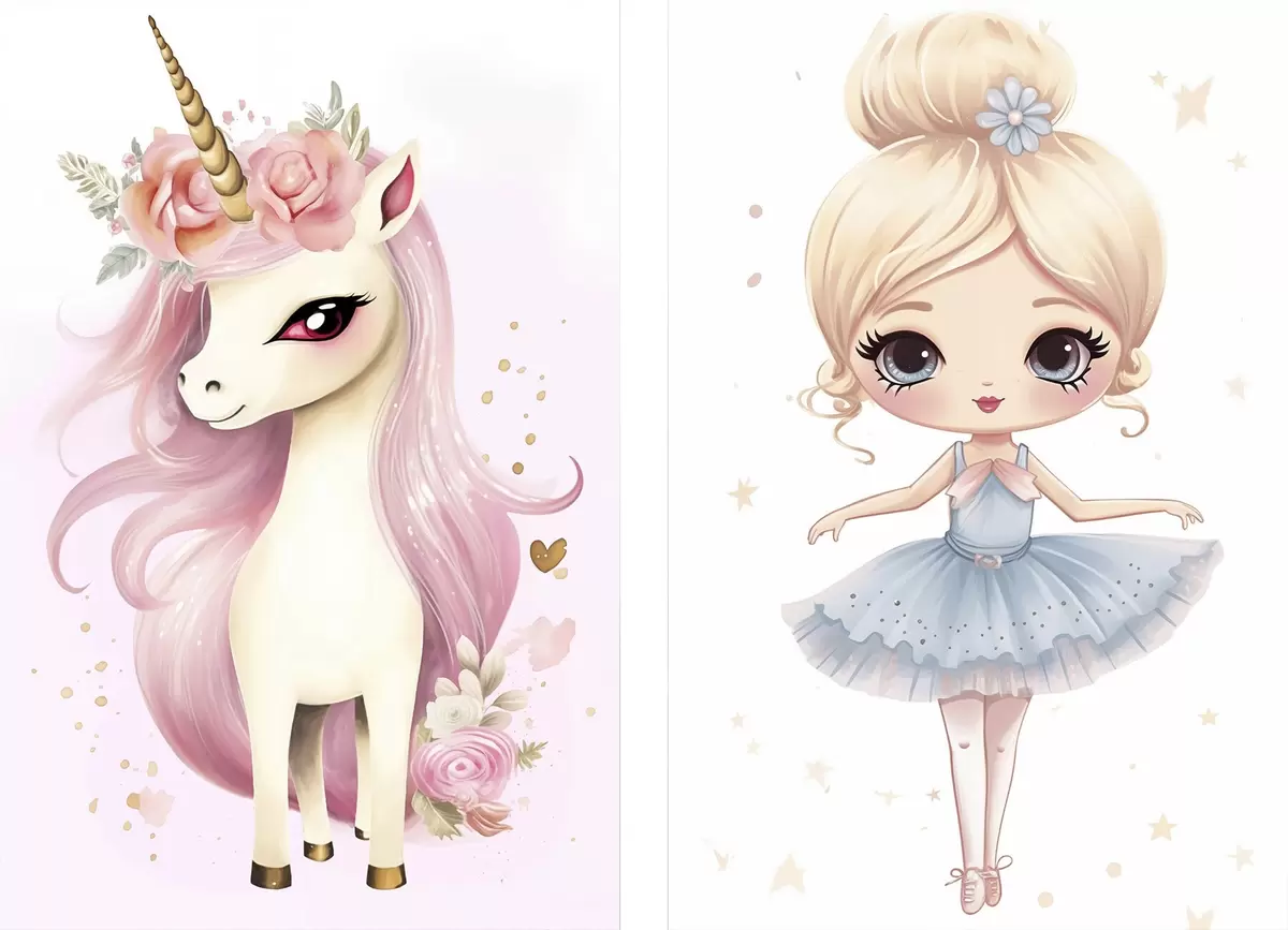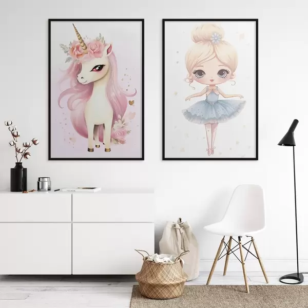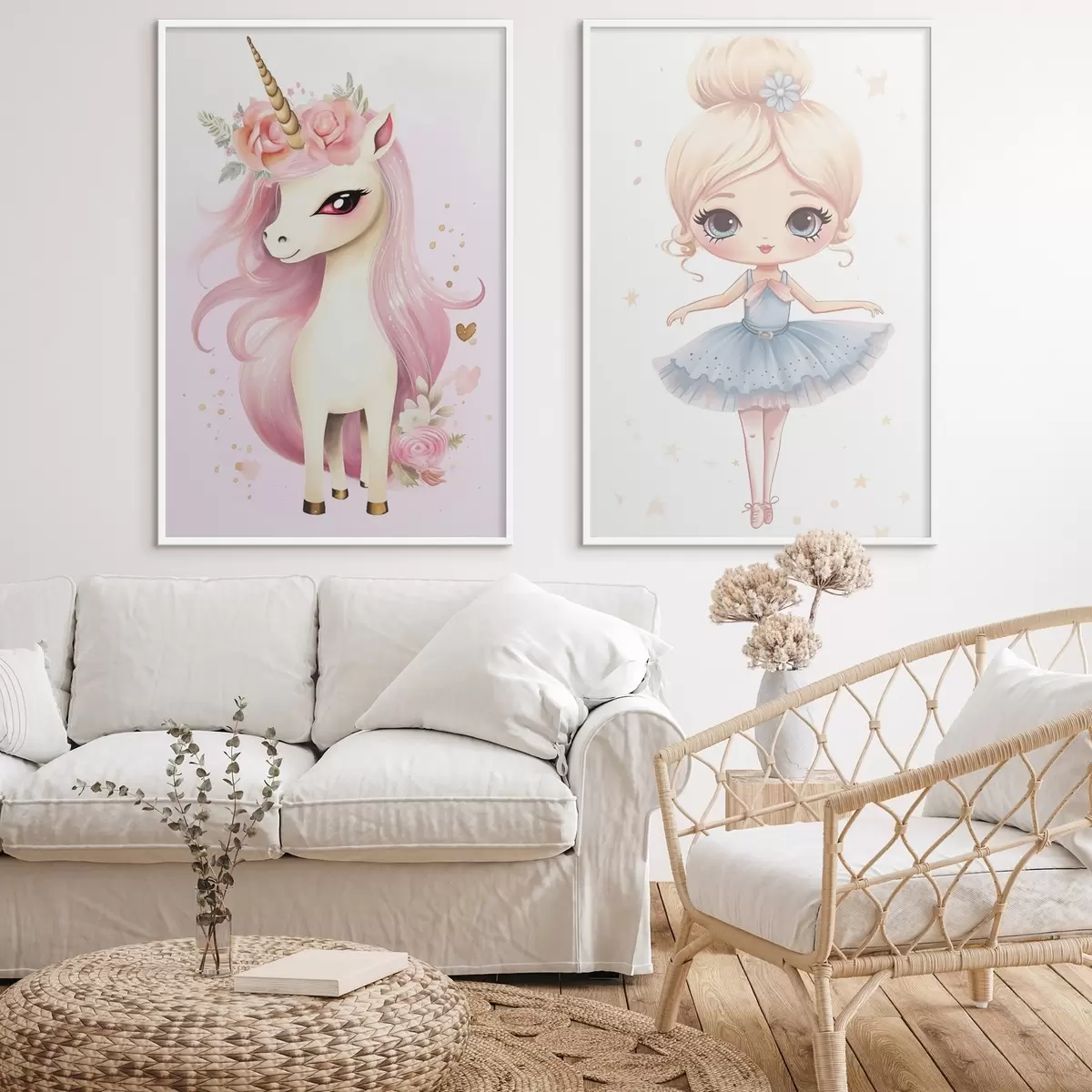 Poster Lalka baletnica w niebieskiej sukience i jednorożec z różową grzywą Nr d00692