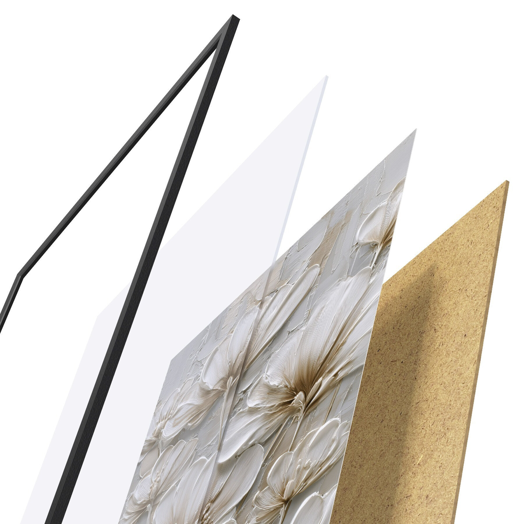 Plakat składa się z ramy, pleksi, wydrukowanego obrazu i podkładu z płyty wiórowej. Plakat można natychmiast zawiesić na ścianie dzięki uchwytom z tyłu.