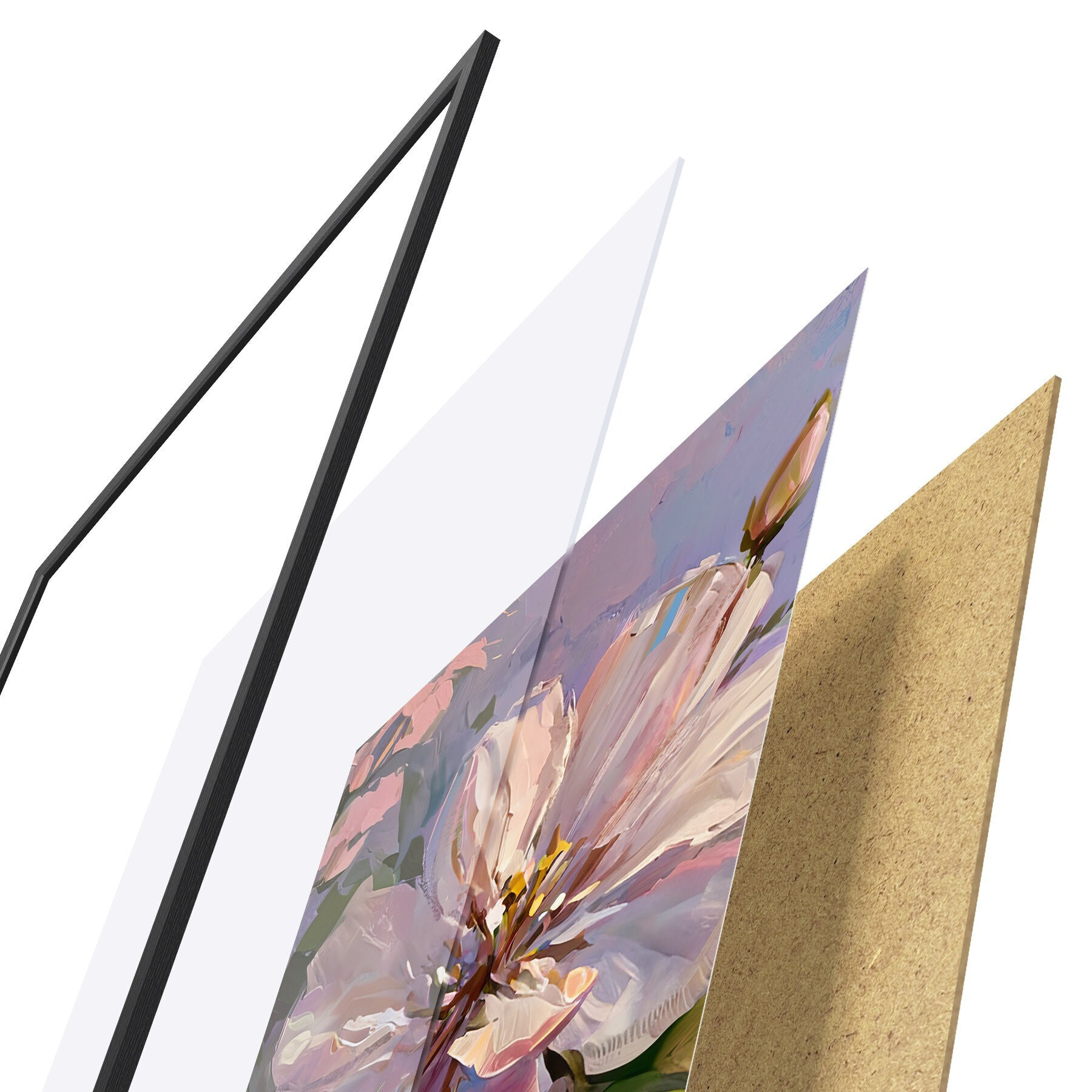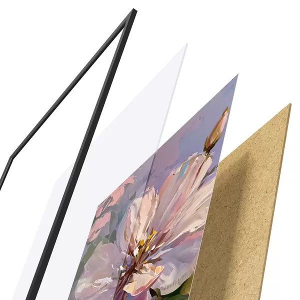 Plakat składa się z ramy, pleksi, wydrukowanego obrazu i podkładu z płyty wiórowej. Plakat można natychmiast zawiesić na ścianie dzięki uchwytom z tyłu.