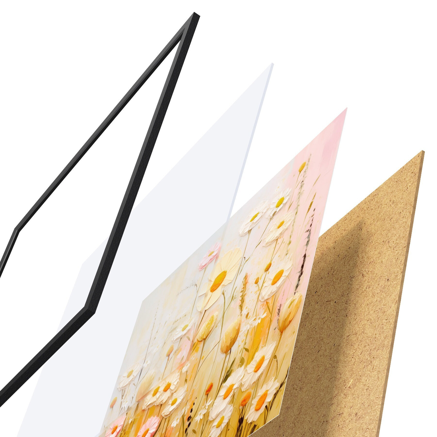 Plakat składa się z ramy, pleksi, wydrukowanego obrazu i podkładu z płyty wiórowej. Plakat można natychmiast zawiesić na ścianie dzięki uchwytom z tyłu.