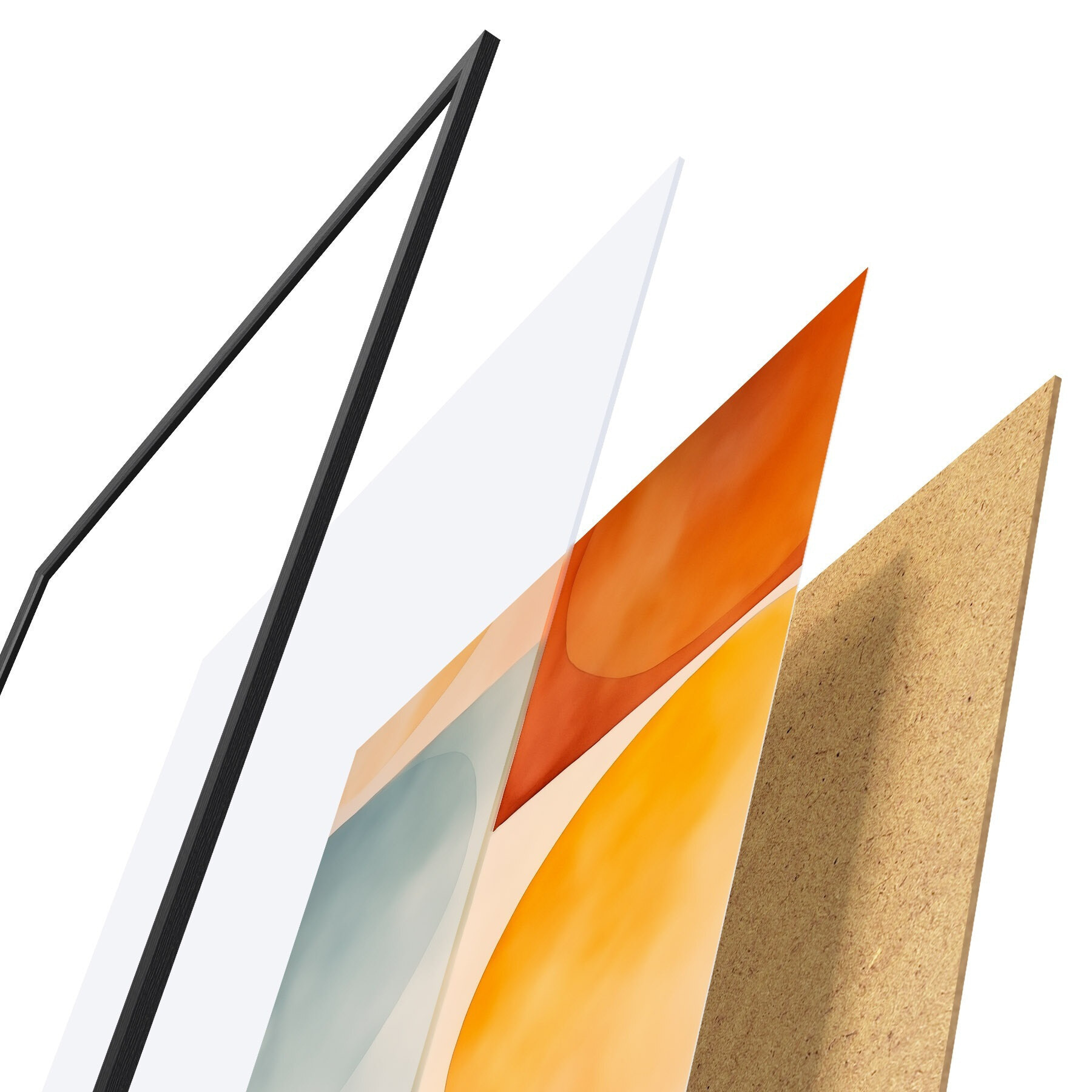 Plakat składa się z ramy, pleksi, wydrukowanego obrazu i podkładu z płyty wiórowej. Plakat można natychmiast zawiesić na ścianie dzięki uchwytom z tyłu.
