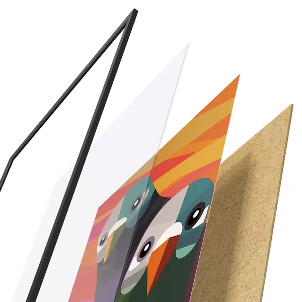 Plakat składa się z ramy, pleksi, wydrukowanego obrazu i podkładu z płyty wiórowej. Plakat można natychmiast zawiesić na ścianie dzięki uchwytom z tyłu.