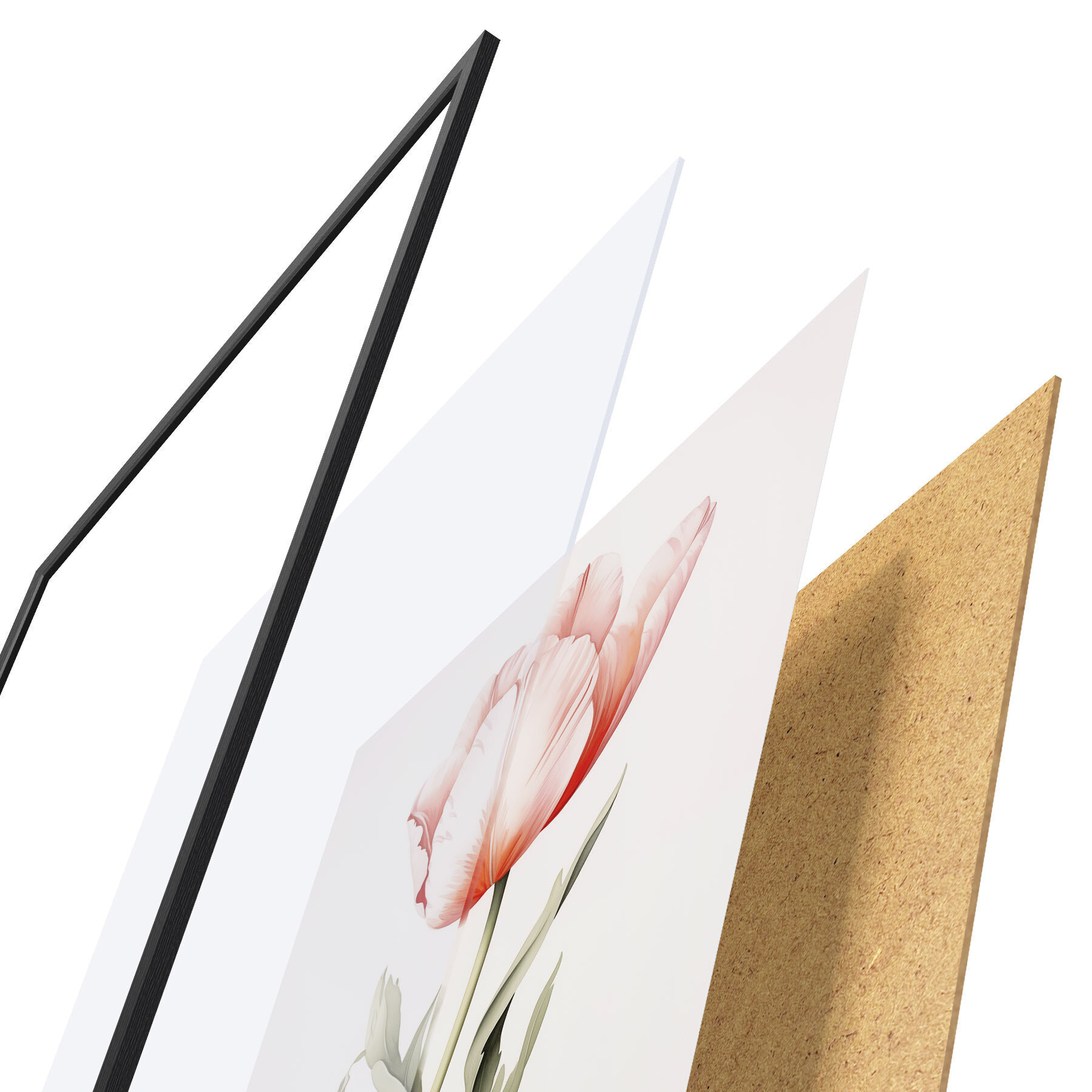 Plakat składa się z ramy, pleksi, wydrukowanego obrazu i podkładu z płyty wiórowej. Plakat można natychmiast zawiesić na ścianie dzięki uchwytom z tyłu.