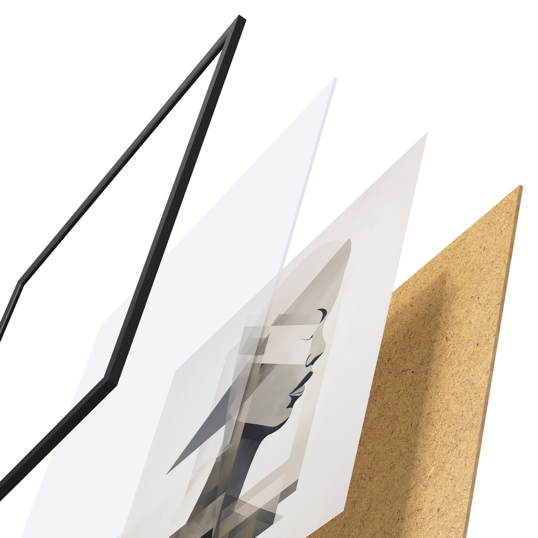 Plakat składa się z ramy, pleksi, wydrukowanego obrazu i podkładu z płyty wiórowej. Plakat można natychmiast zawiesić na ścianie dzięki uchwytom z tyłu.