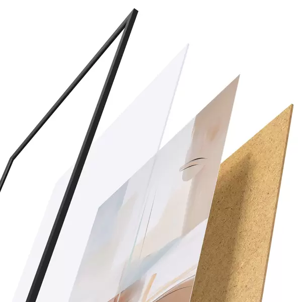 Plakat składa się z ramy, pleksi, wydrukowanego obrazu i podkładu z płyty wiórowej. Plakat można natychmiast zawiesić na ścianie dzięki uchwytom z tyłu.