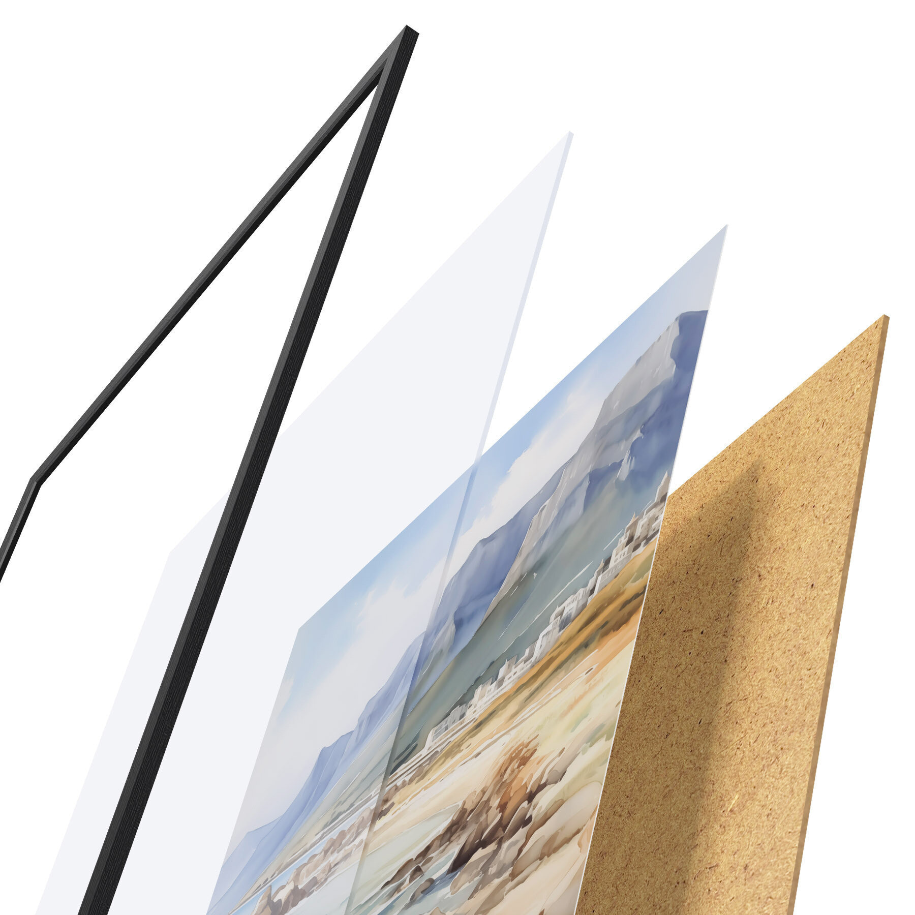 Plakat składa się z ramy, pleksi, wydrukowanego obrazu i podkładu z płyty wiórowej. Plakat można natychmiast zawiesić na ścianie dzięki uchwytom z tyłu.