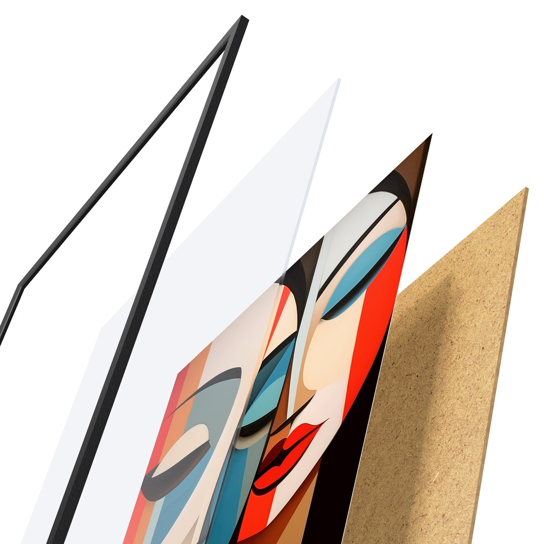 Plakat składa się z ramy, pleksi, wydrukowanego obrazu i podkładu z płyty wiórowej. Plakat można natychmiast zawiesić na ścianie dzięki uchwytom z tyłu.