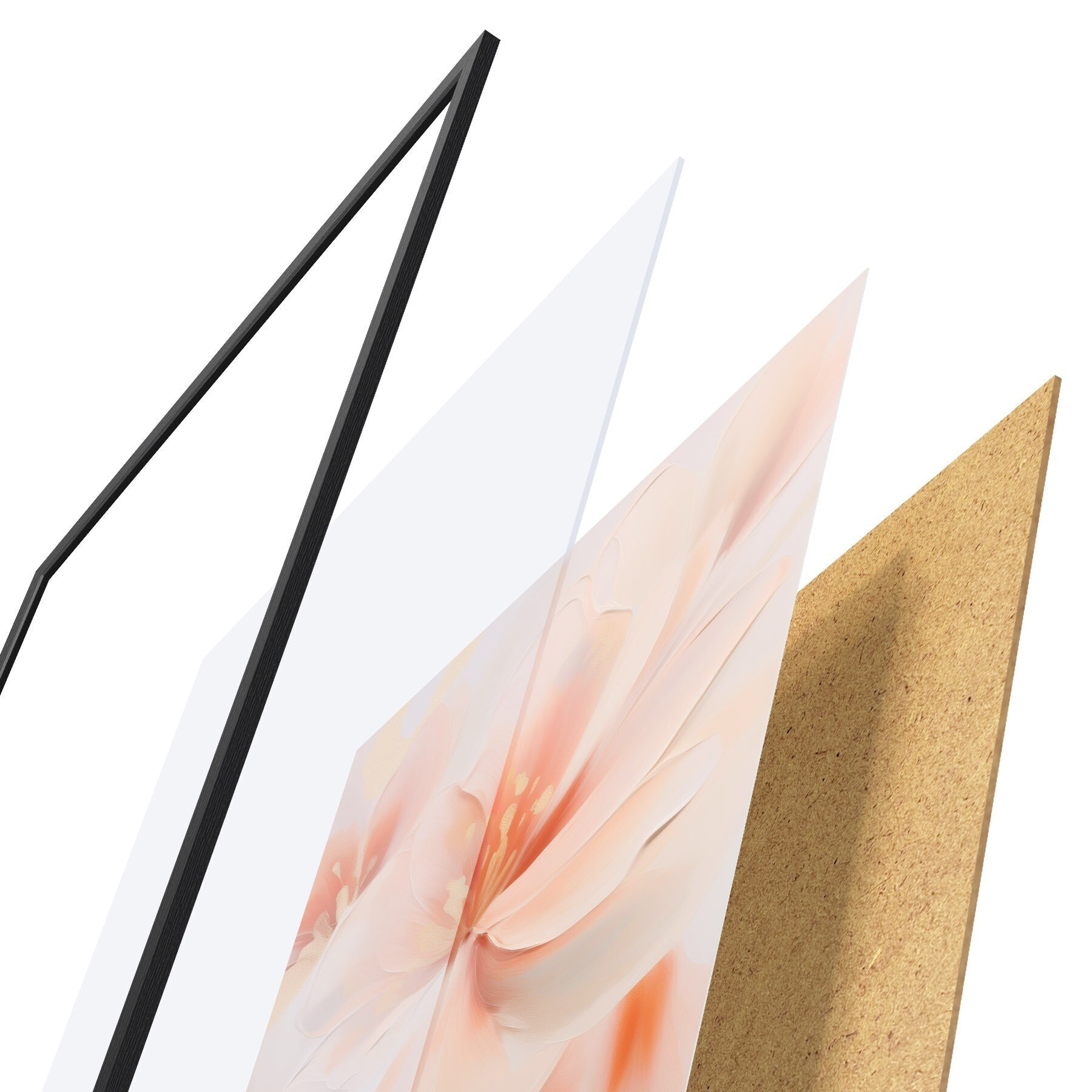 Plakat składa się z ramy, pleksi, wydrukowanego obrazu i podkładu z płyty wiórowej. Plakat można natychmiast zawiesić na ścianie dzięki uchwytom z tyłu.