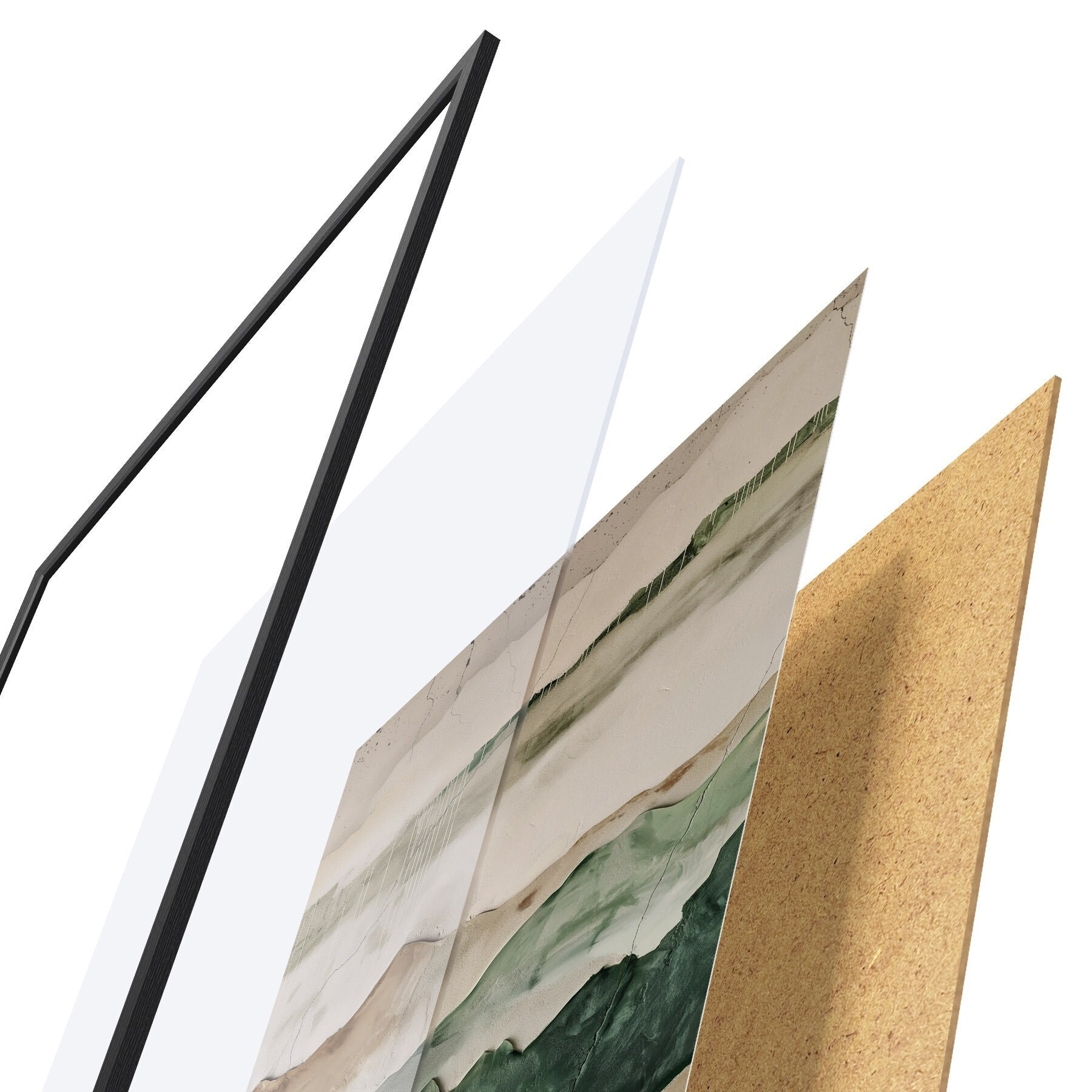 Plakat składa się z ramy, pleksi, wydrukowanego obrazu i podkładu z płyty wiórowej. Plakat można natychmiast zawiesić na ścianie dzięki uchwytom z tyłu.
