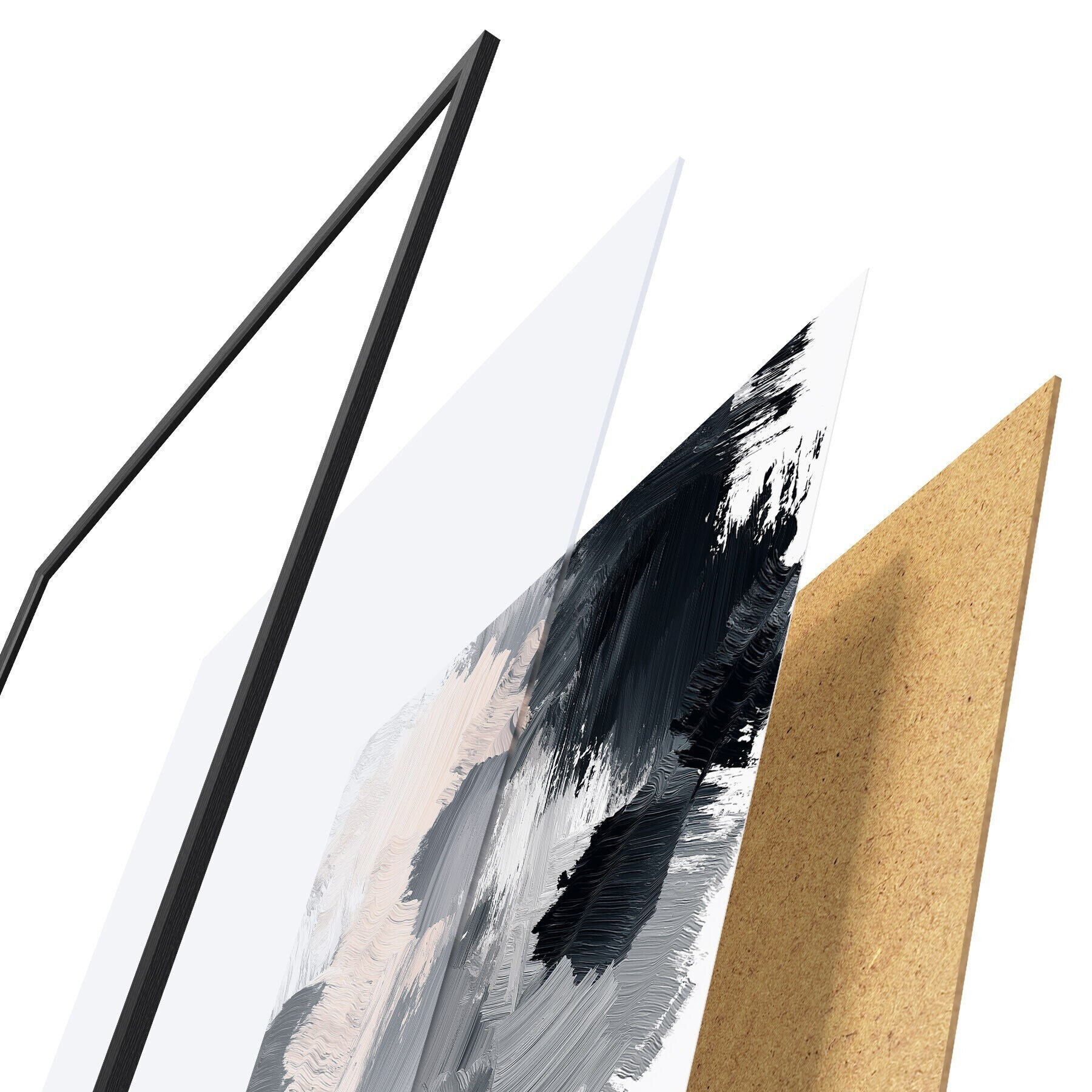 Plakat składa się z ramy, pleksi, wydrukowanego obrazu i podkładu z płyty wiórowej. Plakat można natychmiast zawiesić na ścianie dzięki uchwytom z tyłu.