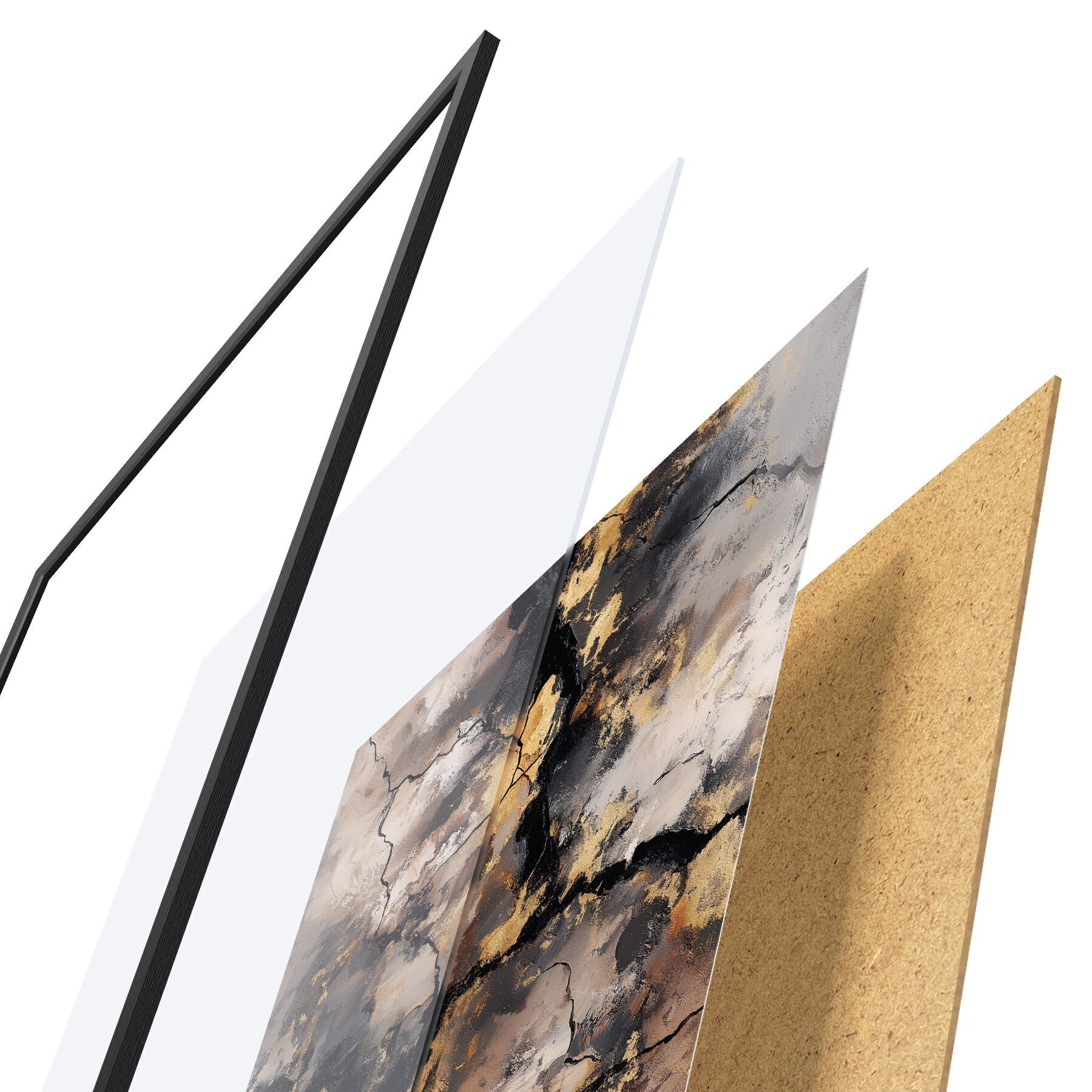 Plakat składa się z ramy, pleksi, wydrukowanego obrazu i podkładu z płyty wiórowej. Plakat można natychmiast zawiesić na ścianie dzięki uchwytom z tyłu.