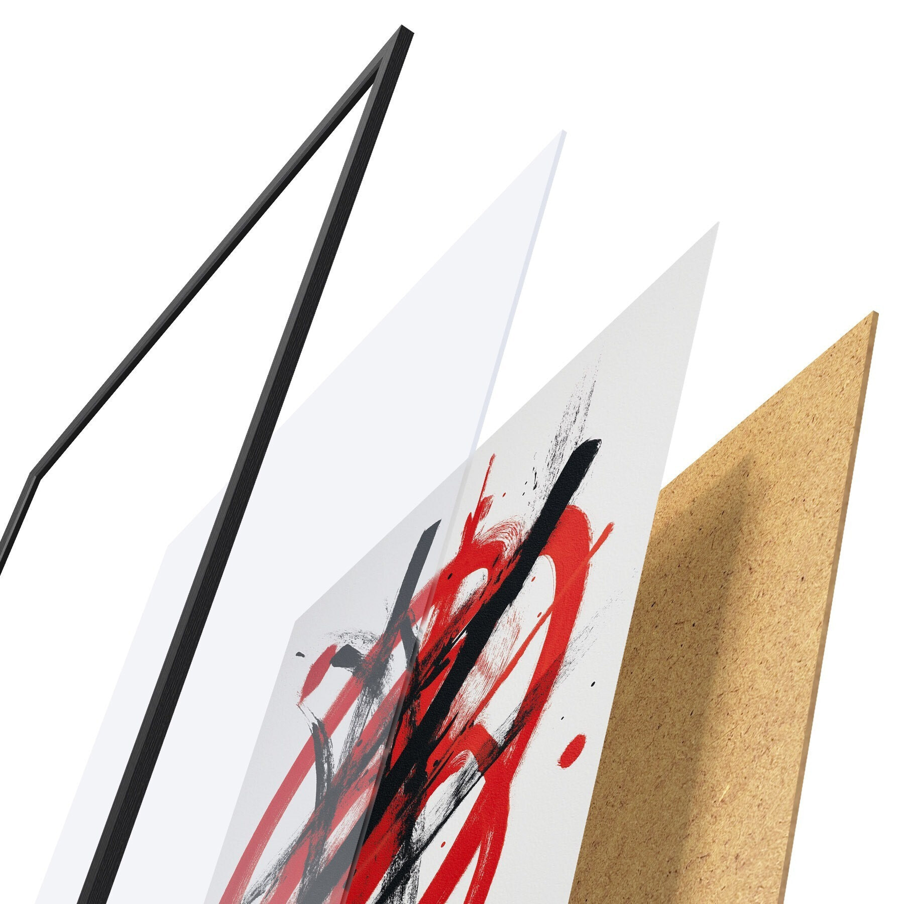 Plakat składa się z ramy, pleksi, wydrukowanego obrazu i podkładu z płyty wiórowej. Plakat można natychmiast zawiesić na ścianie dzięki uchwytom z tyłu.