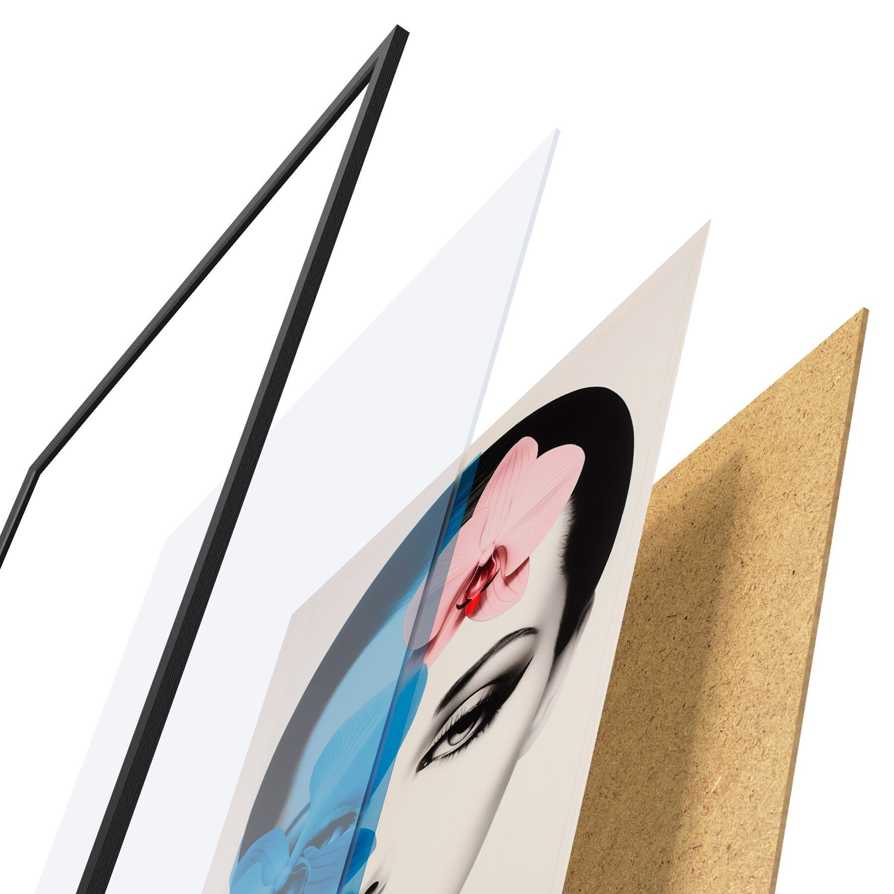 Plakat składa się z ramy, pleksi, wydrukowanego obrazu i podkładu z płyty wiórowej. Plakat można natychmiast zawiesić na ścianie dzięki uchwytom z tyłu.