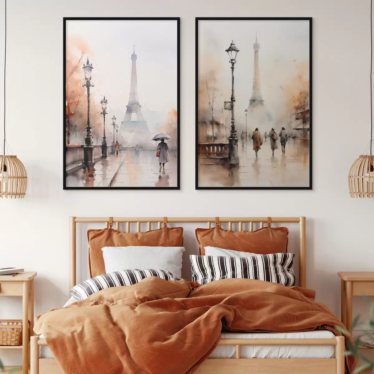 Plakat Deszczowy jesienny dzień w Paryżu z Wieżą Eiffla w tle i zabytkowymi latarniami ulicznymi d00821