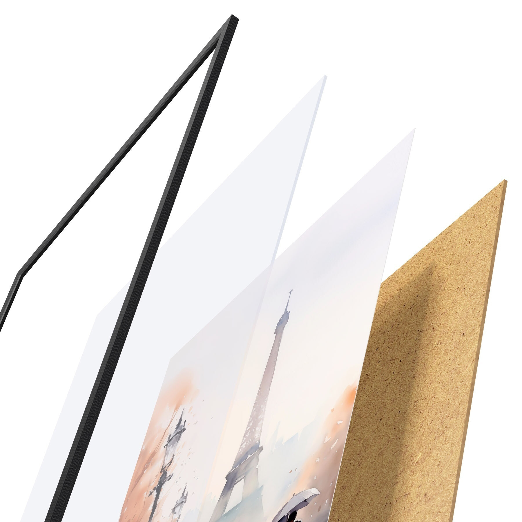 Plakat składa się z ramy, pleksi, wydrukowanego obrazu i podkładu z płyty wiórowej. Plakat można natychmiast zawiesić na ścianie dzięki uchwytom z tyłu.