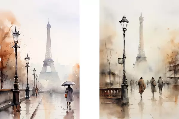 Plakat Deszczowy jesienny dzień w Paryżu z Wieżą Eiffla w tle i zabytkowymi latarniami ulicznymi d00821