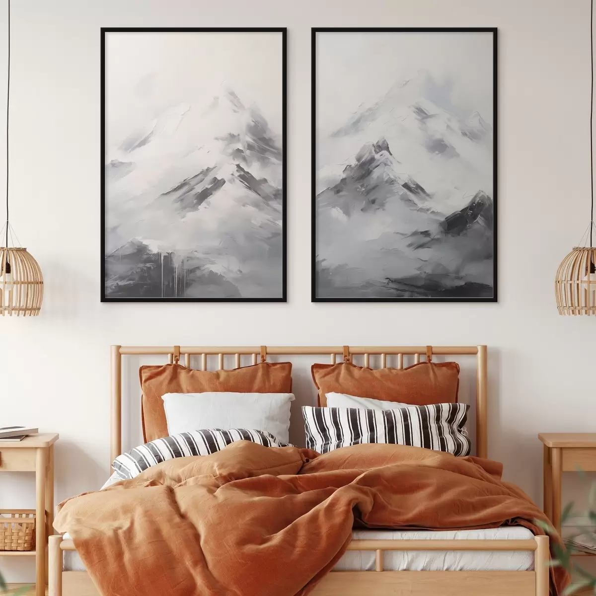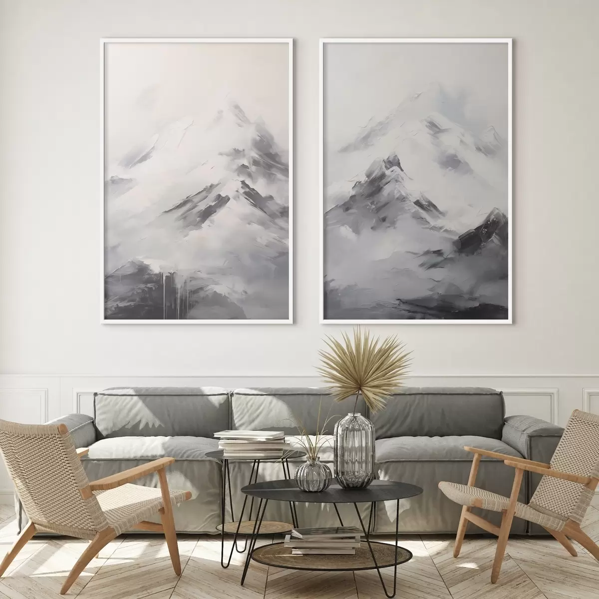 Plakat Ośnieżone szczyty górskie z szarymi cieniami, szare niebo, pociągnięcia pędzla, teksturowane, minimalistyczne d00822