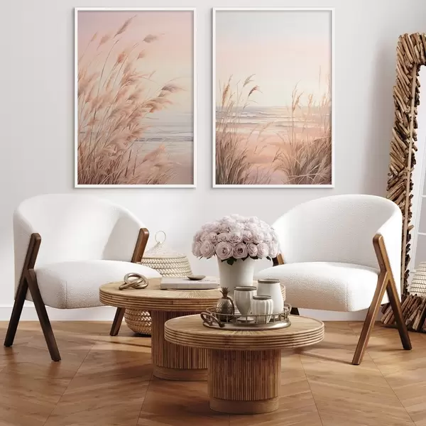 Plakat Trawa pampasowa w pastelowej pomarańczowej kolorystyce, jasnoróżowe niebo, spokojny krajobraz d00823