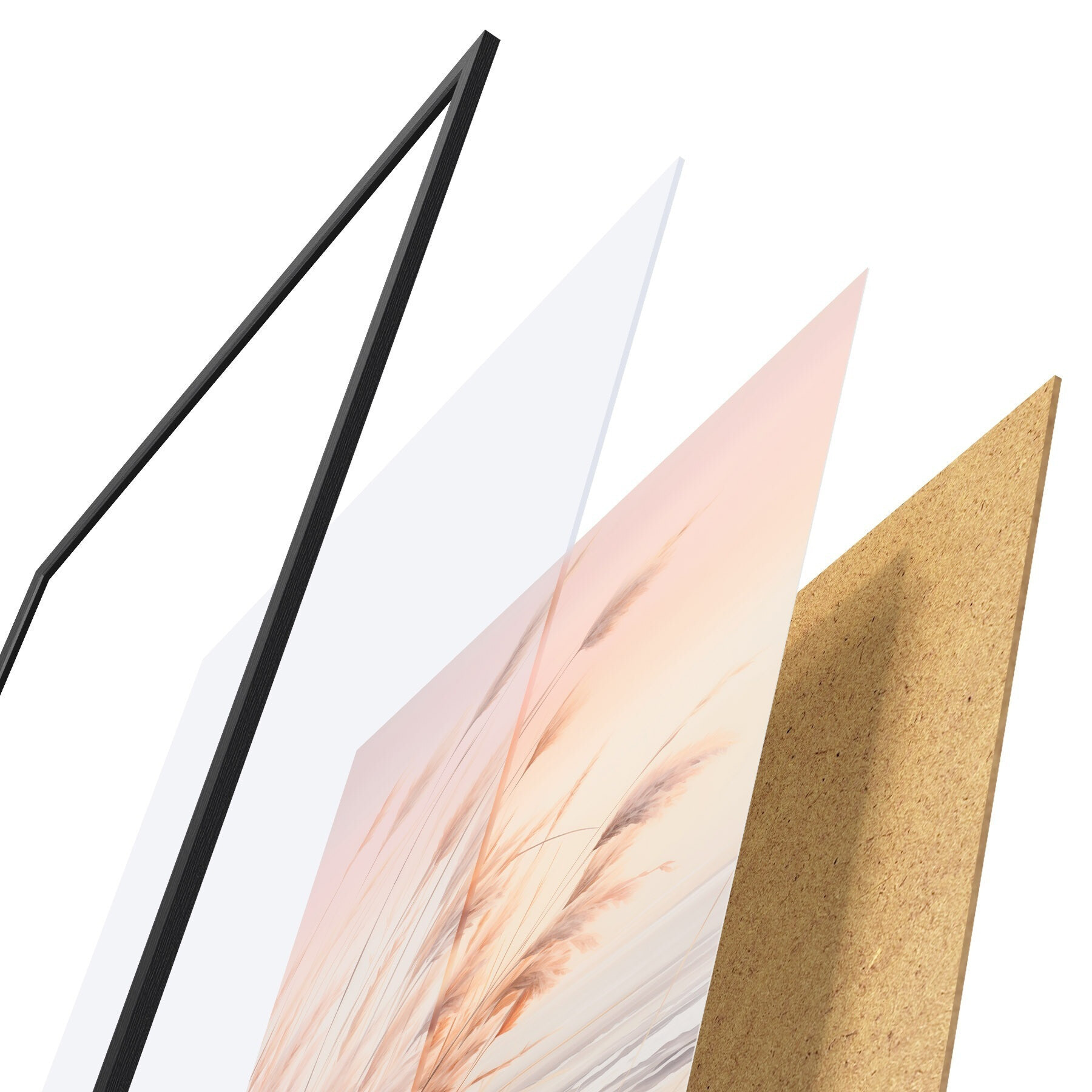 Plakat składa się z ramy, pleksi, wydrukowanego obrazu i podkładu z płyty wiórowej. Plakat można natychmiast zawiesić na ścianie dzięki uchwytom z tyłu.
