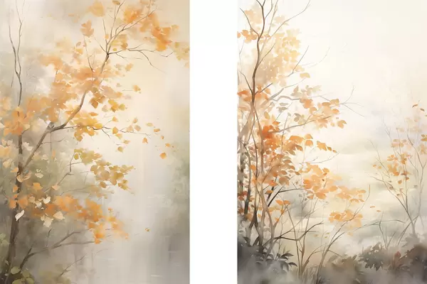 Poster Jesienne drzewa z pomarańczowymi liśćmi i gałęziami, delikatna akwarela, subtelne pociągnięcia pędzla Nr d00826