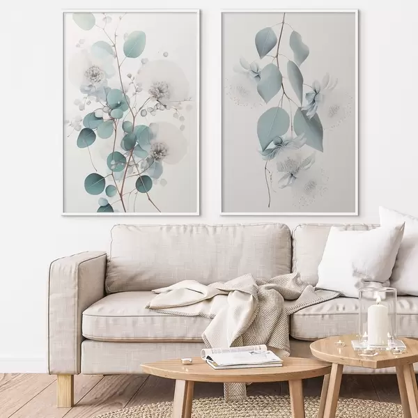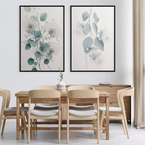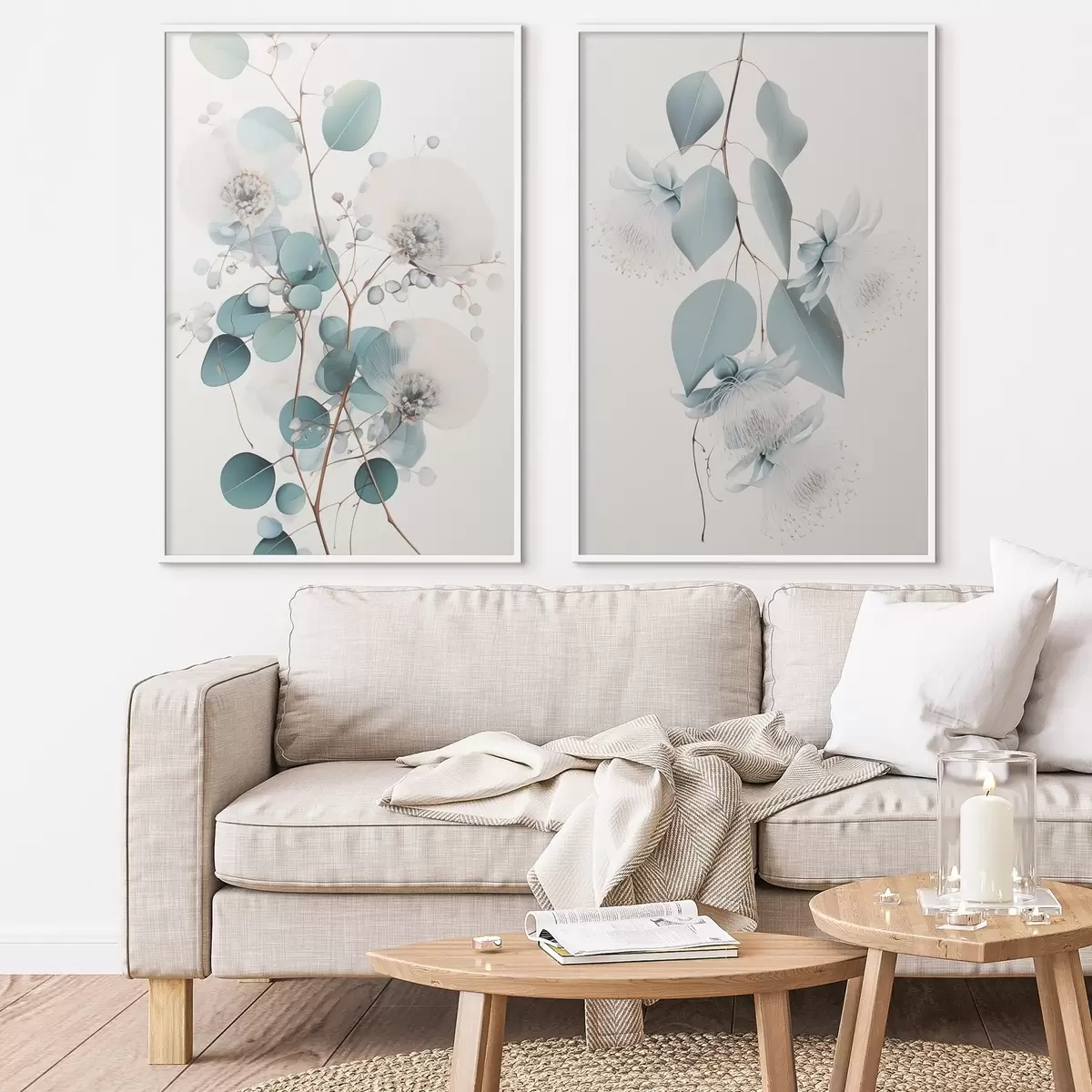 Plakat Gałąź eukaliptusa z niebieskimi liśćmi i białymi kwiatami, jasne tło d00829