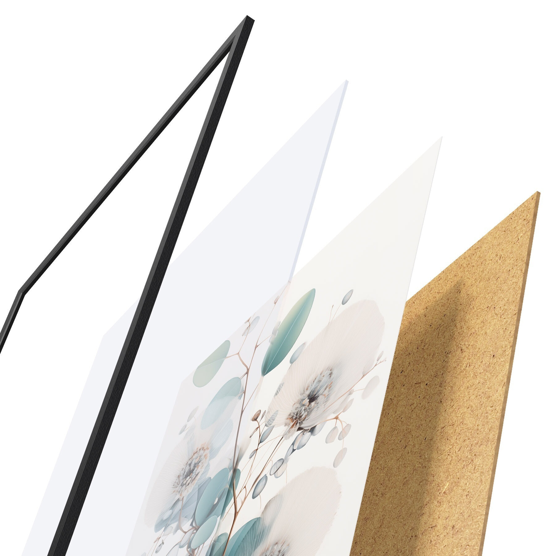 Plakat składa się z ramy, pleksi, wydrukowanego obrazu i podkładu z płyty wiórowej. Plakat można natychmiast zawiesić na ścianie dzięki uchwytom z tyłu.