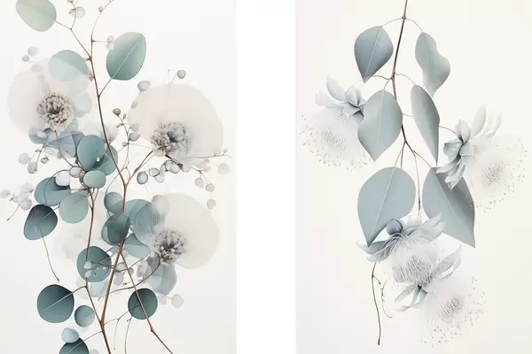 Poster Gałąź eukaliptusa z niebieskimi liśćmi i białymi kwiatami, jasne tło Nr d00829