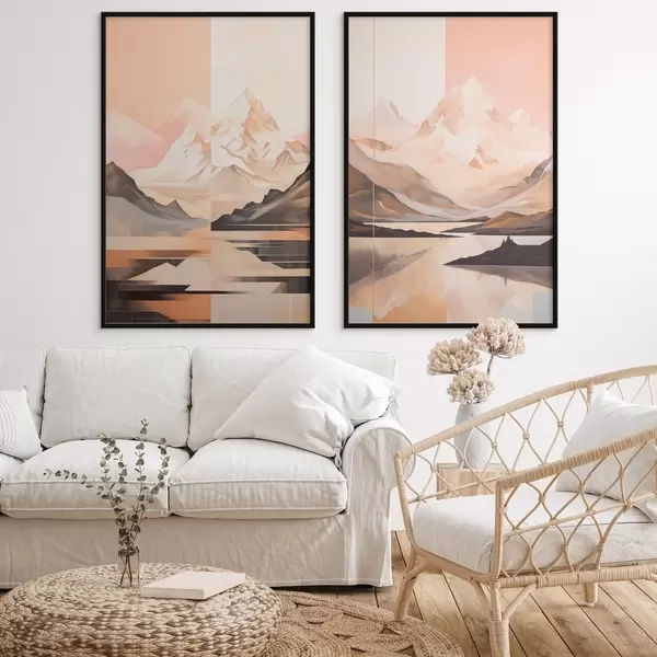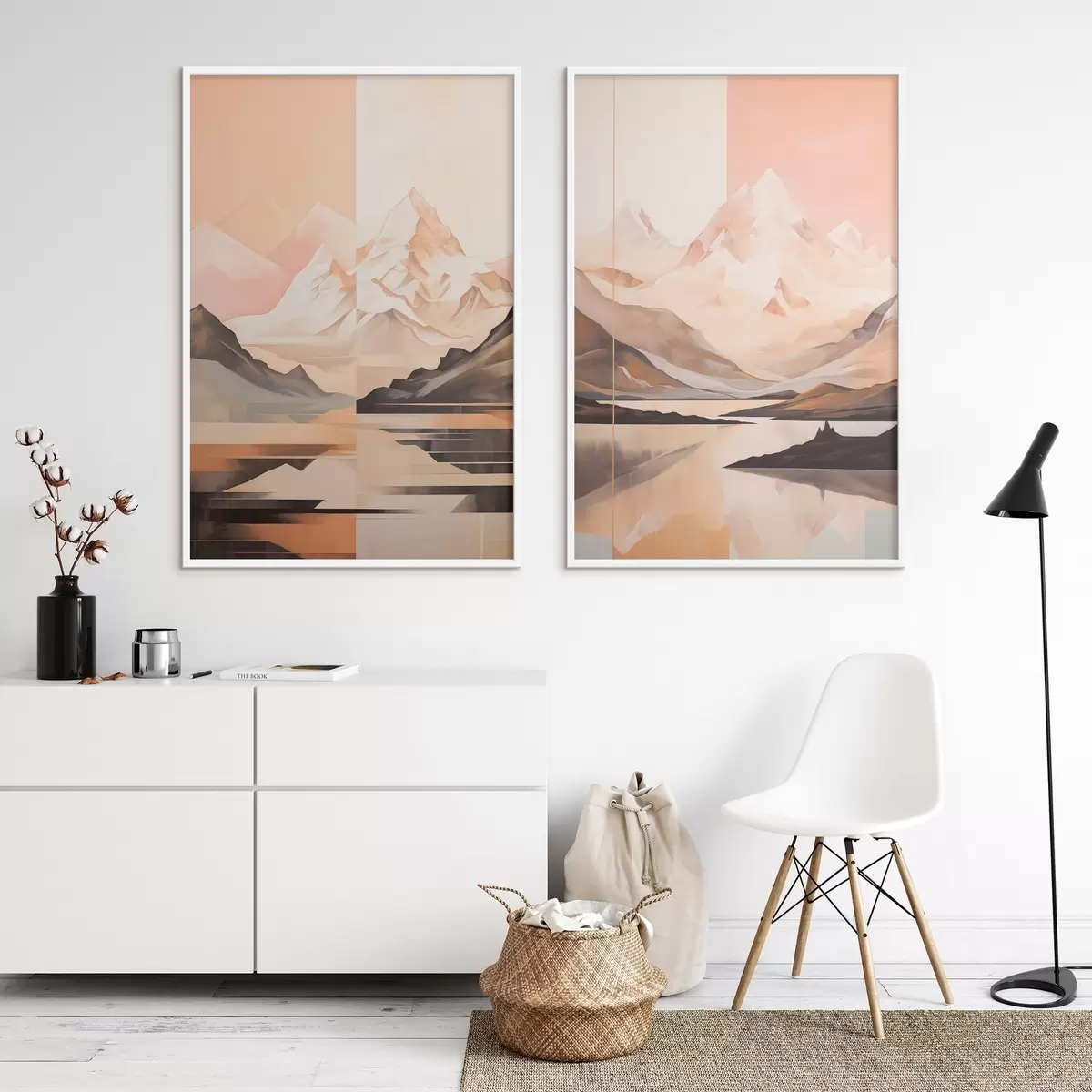 Poster Abstrakcyjny krajobraz z górami i jeziorem, pastelowe kolory, minimalistyczny styl Nr d00830