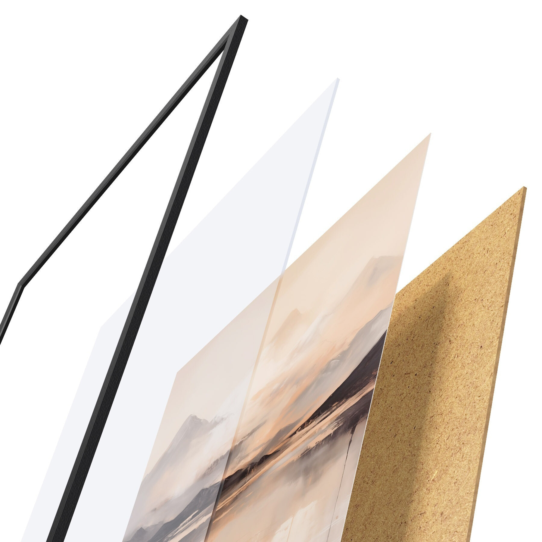 Plakat składa się z ramy, pleksi, wydrukowanego obrazu i podkładu z płyty wiórowej. Plakat można natychmiast zawiesić na ścianie dzięki uchwytom z tyłu.