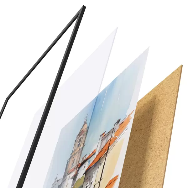 Plakat składa się z ramy, pleksi, wydrukowanego obrazu i podkładu z płyty wiórowej. Plakat można natychmiast zawiesić na ścianie dzięki uchwytom z tyłu.