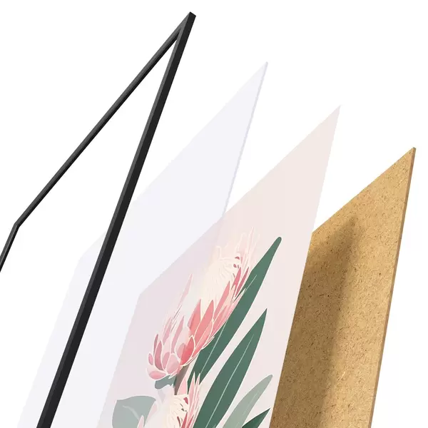 Plakat składa się z ramy, pleksi, wydrukowanego obrazu i podkładu z płyty wiórowej. Plakat można natychmiast zawiesić na ścianie dzięki uchwytom z tyłu.