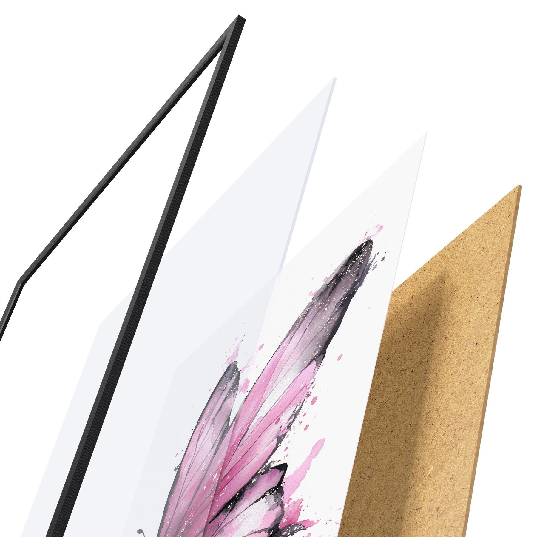 Plakat składa się z ramy, pleksi, wydrukowanego obrazu i podkładu z płyty wiórowej. Plakat można natychmiast zawiesić na ścianie dzięki uchwytom z tyłu.