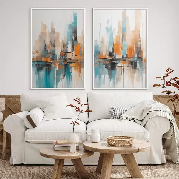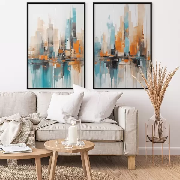 Plakat Abstrakcyjny pejzaż miejski z pionowymi pociągnięciami pędzla w odcieniach pomarańczowego, niebieskiego i białego, styl malarski d00876