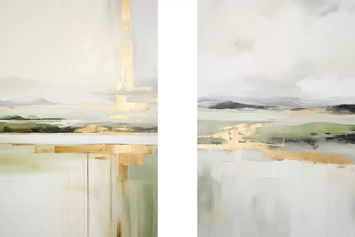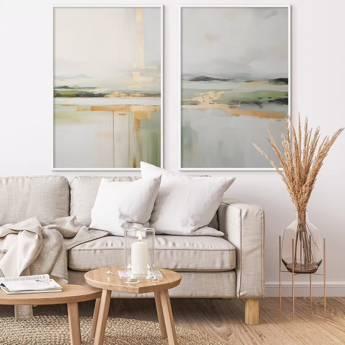 Poster Abstrakcyjny pejzaż z żółtymi akcentami, minimalistyczna kompozycja ziemi, wody i nieba, w stonowanej kolorystyce Nr d00877