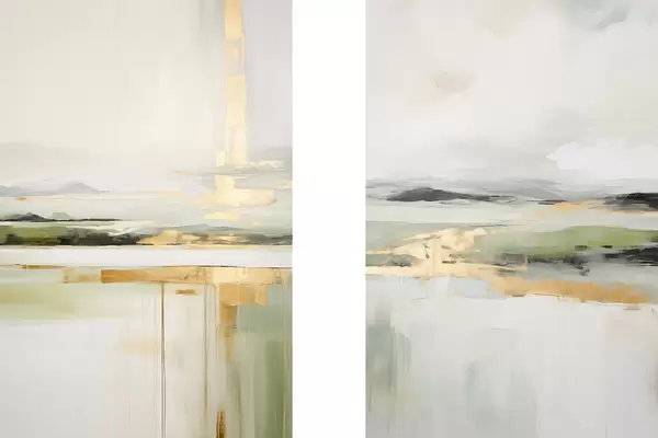 Plakat Abstrakcyjny pejzaż z żółtymi akcentami, minimalistyczna kompozycja ziemi, wody i nieba, w stonowanej kolorystyce d00877