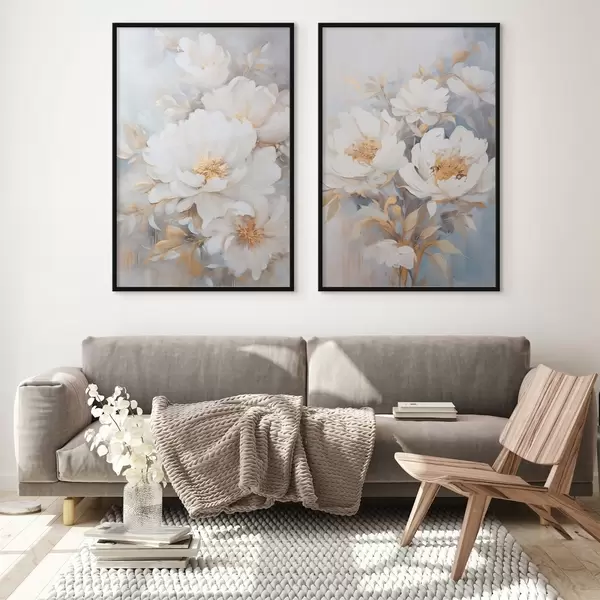 Plakat Białe piwonie z żółtymi środkami i liśćmi, delikatne pociągnięcia pędzla, jasnoniebieskie tło, kompozycja kwiatowa d00878
