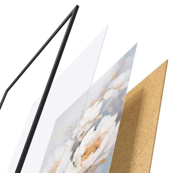 Plakat składa się z ramy, pleksi, wydrukowanego obrazu i podkładu z płyty wiórowej. Plakat można natychmiast zawiesić na ścianie dzięki uchwytom z tyłu.