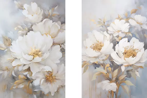 Poster Białe piwonie z żółtymi środkami i liśćmi, delikatne pociągnięcia pędzla, jasnoniebieskie tło, kompozycja kwiatowa Nr d00878